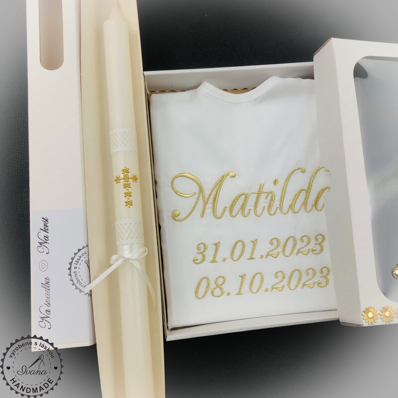 Košieľka na krst k18  zlatá + sviečka na krst zlatý krížik